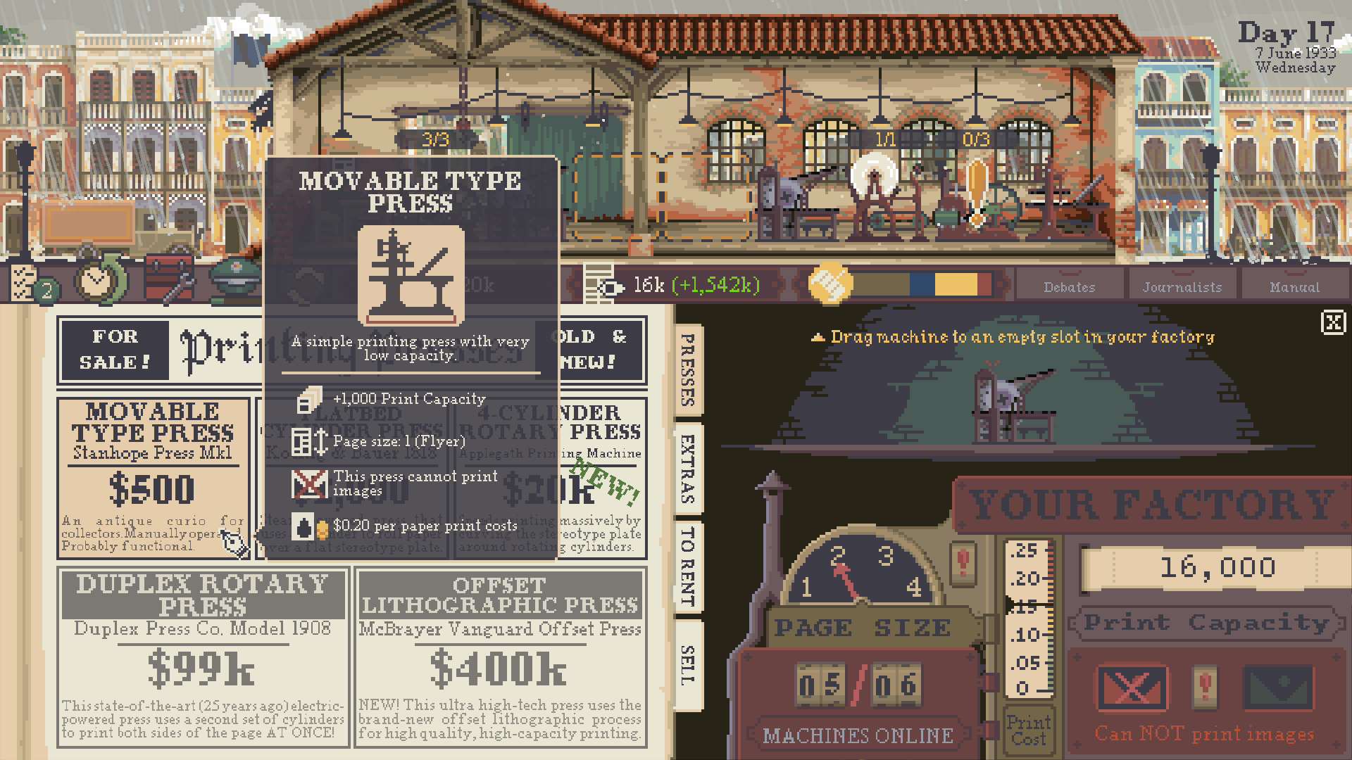 从最简陋的印刷车间起步,你需要不断购置先进设备、扩大产能、提升发行效率,以应对迅速增长的读者需求。随着厂房升级,你将解锁更大纸张、更高印量以及全新的发行策略,在国家 14 个地区中布局投递路线,找到你的核心读者群。