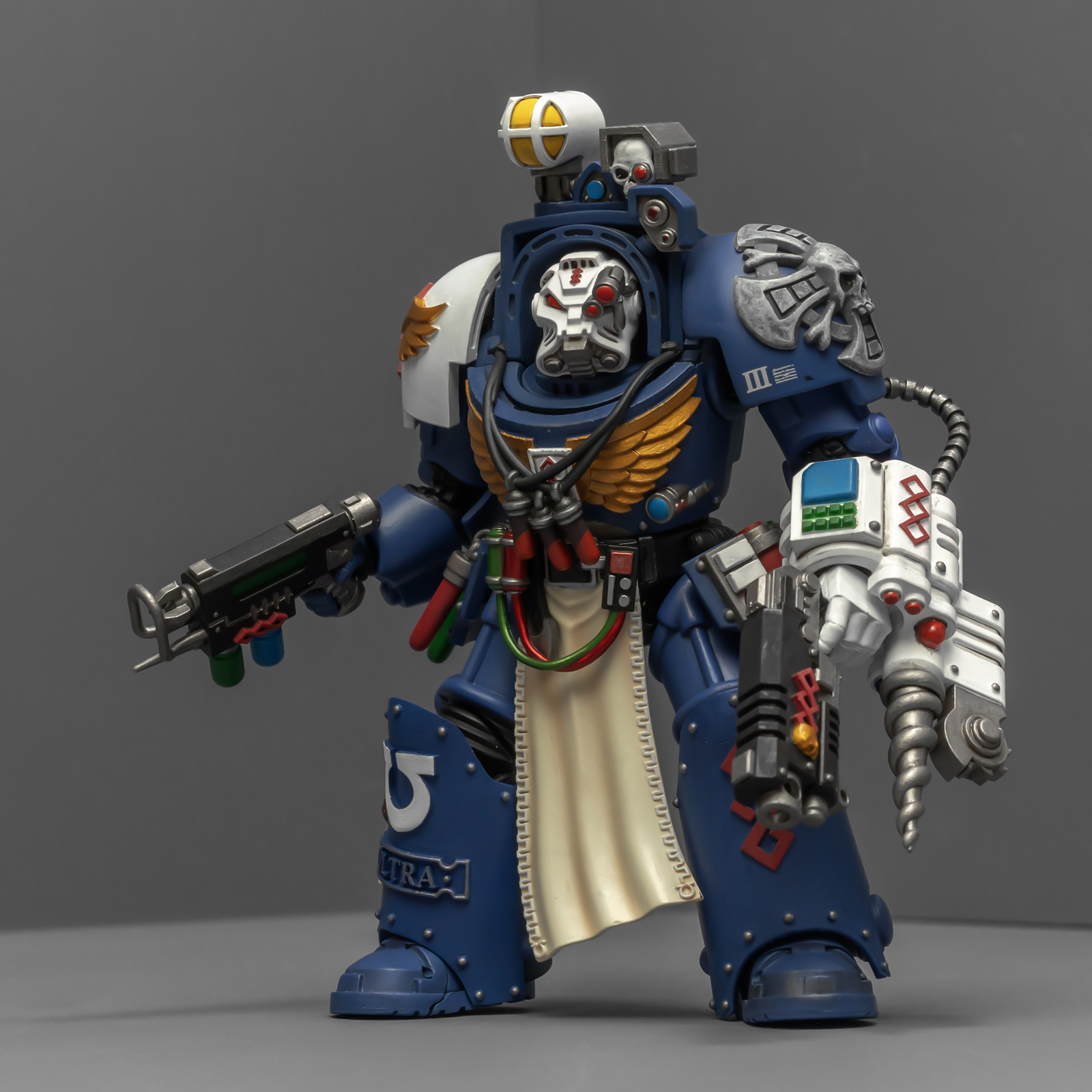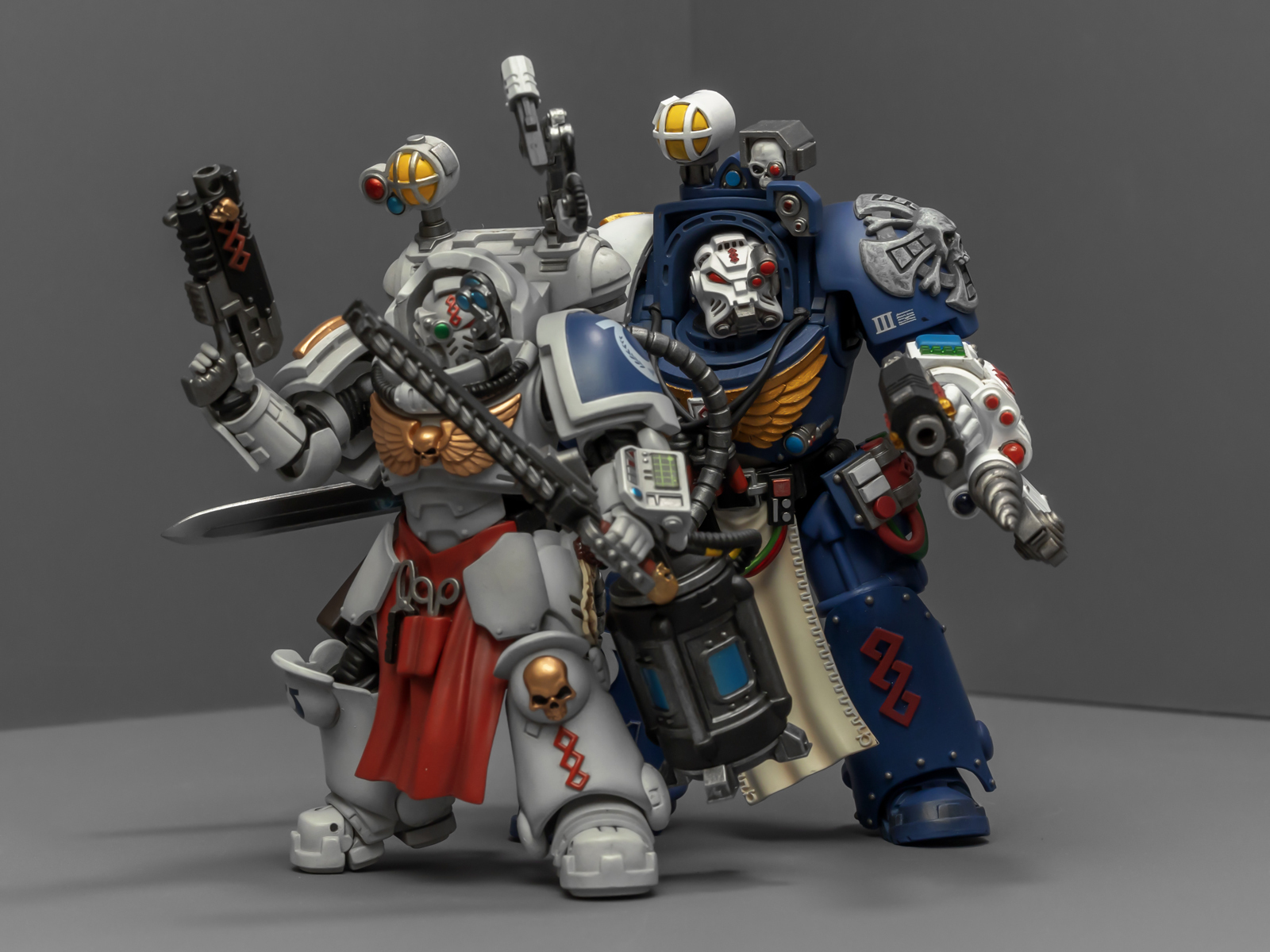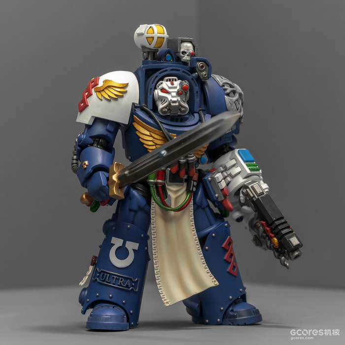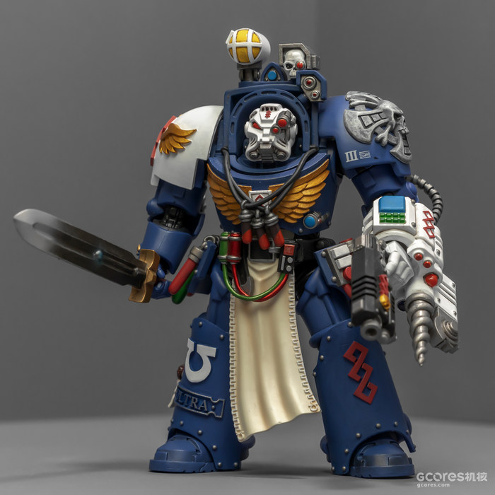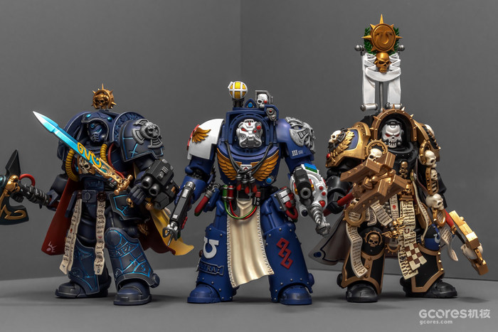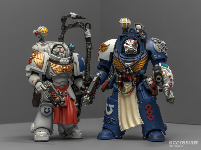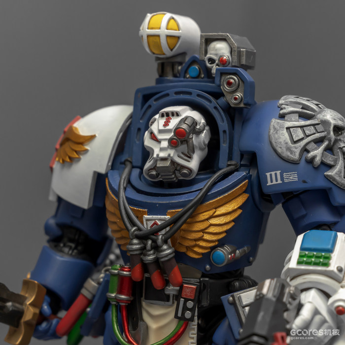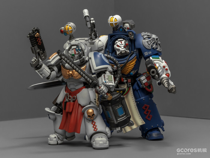 之前收过重甲版的生物药剂师,把两人放在一起,重力甲和终结者甲气质还挺搭。目前手头的极限战士终结者特殊单位里,除了之前用配件魔改的智库和牧师,现在又加入了药剂师,特别小队壮大了。智库和牧师都用了和普通甲相同的头盔,反观那个老老实实戴着终结者头盔的药剂师,和这两位站在一起倒是显得格格不入,我在想,是不是也该给他再换个头了?