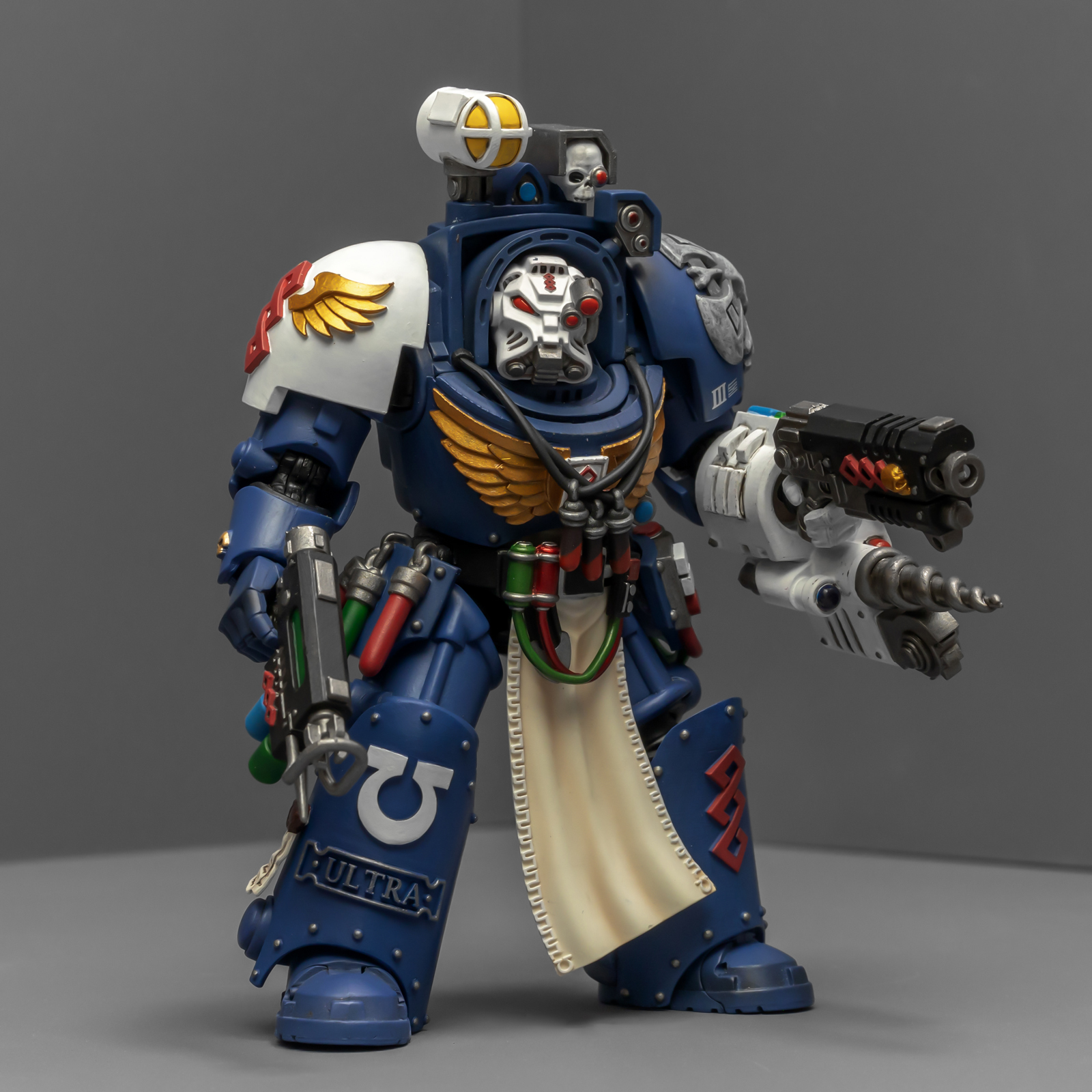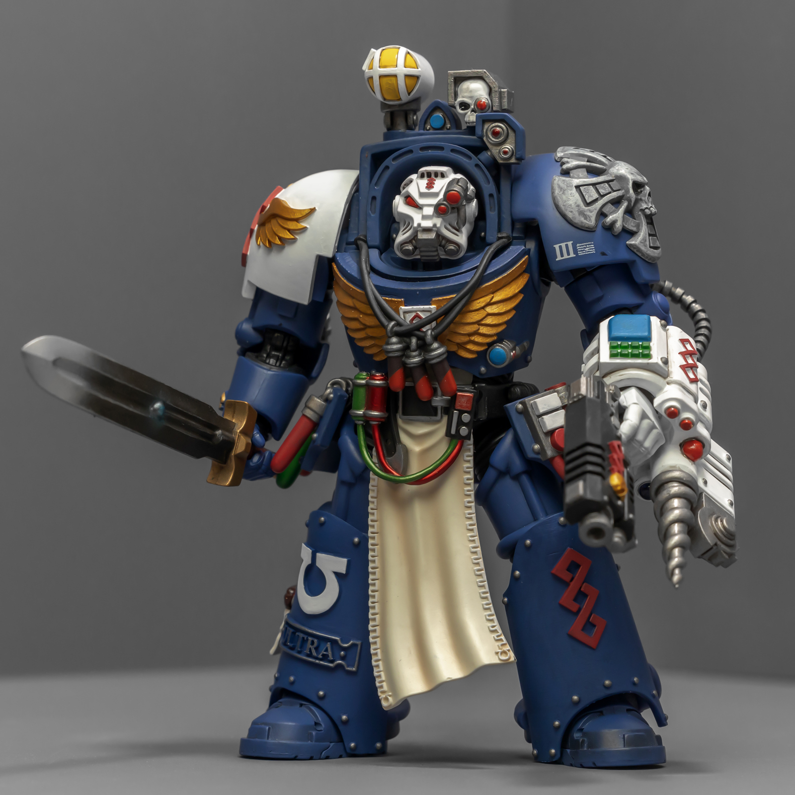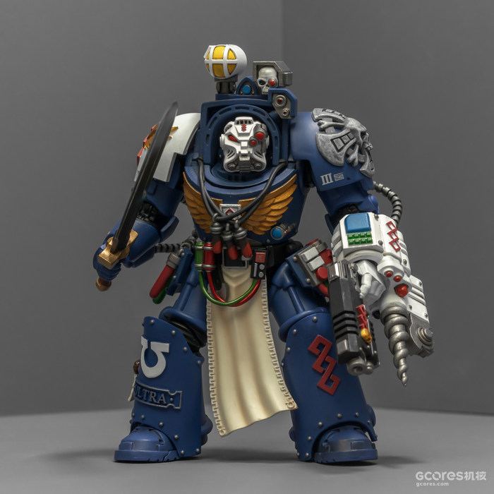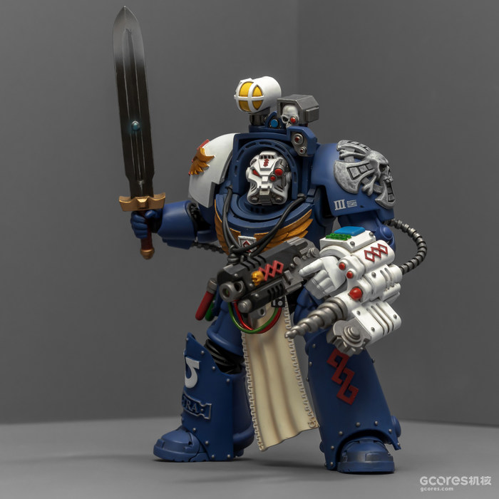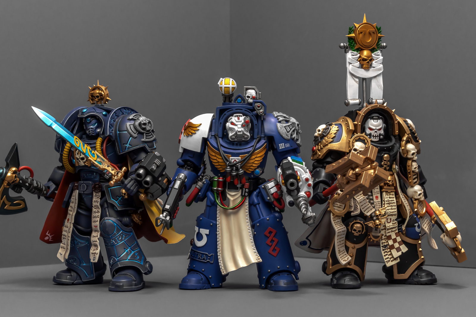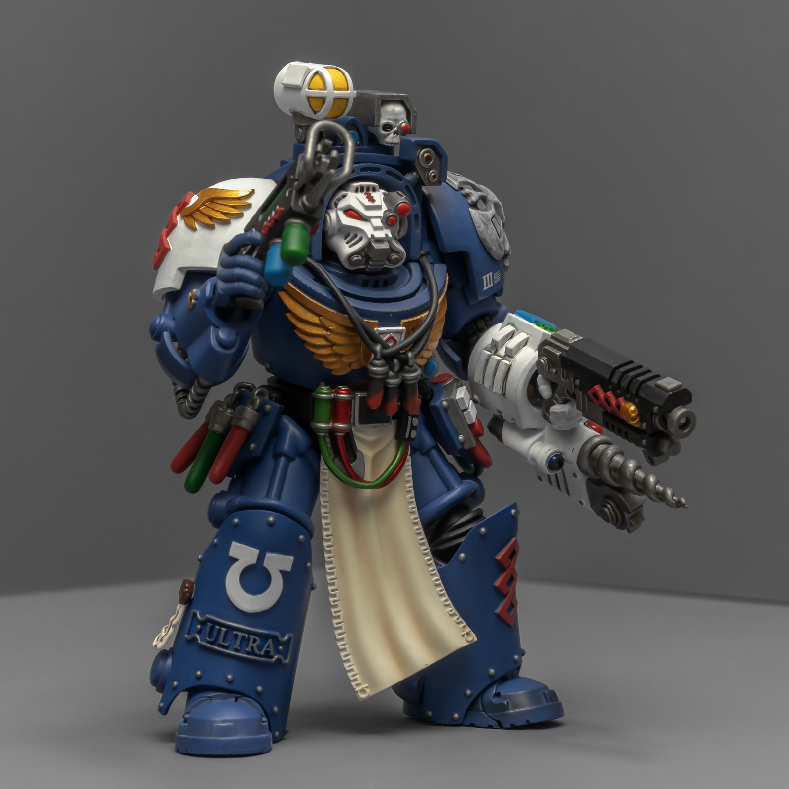 之前收过重甲版的生物药剂师,把两人放在一起,重力甲和终结者甲气质还挺搭。目前手头的极限战士终结者特殊单位里,除了之前用配件魔改的智库和牧师,现在又加入了药剂师,特别小队壮大了。智库和牧师都用了和普通甲相同的头盔,反观那个老老实实戴着终结者头盔的药剂师,和这两位站在一起倒是显得格格不入,我在想,是不是也该给他再换个头了?