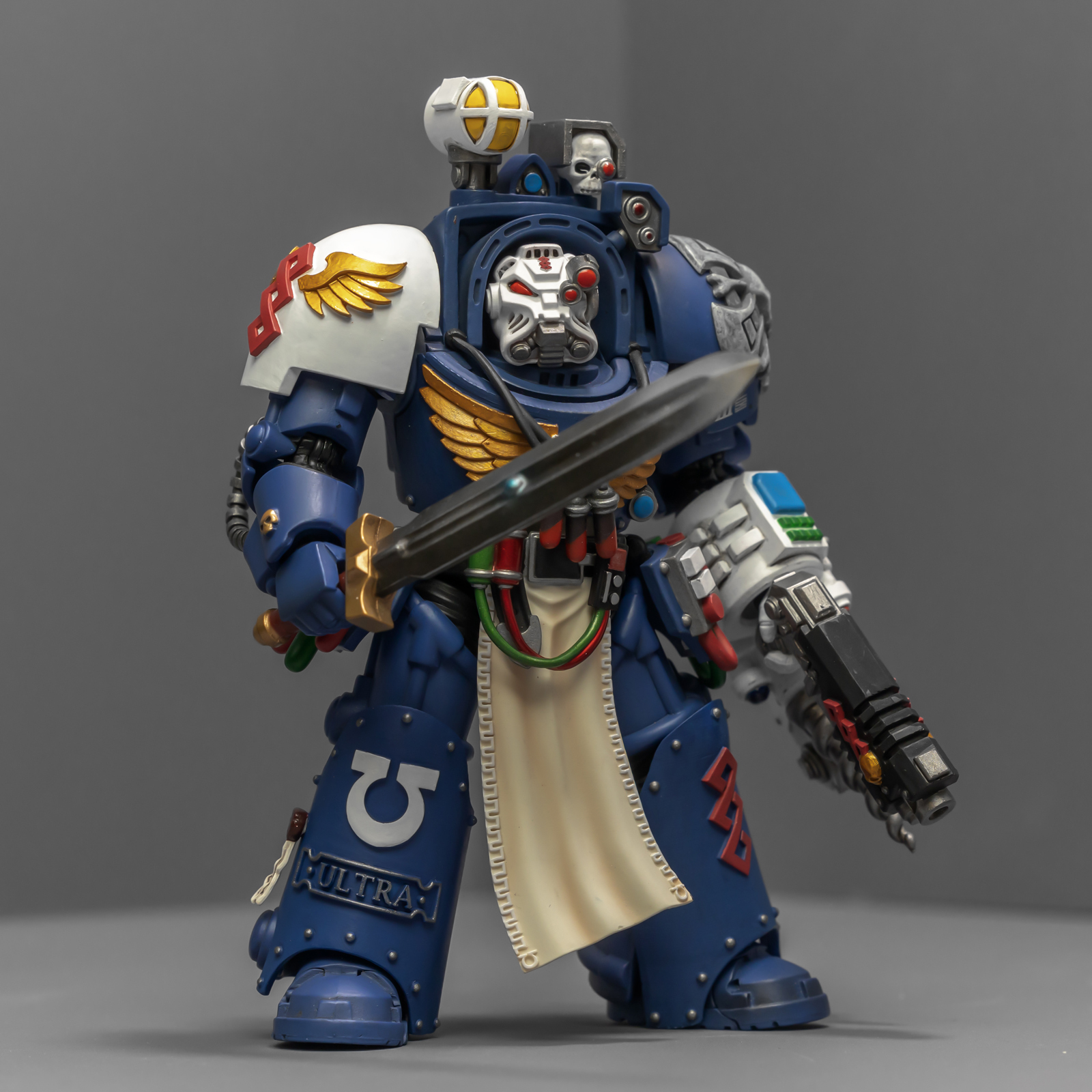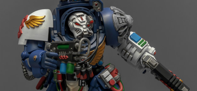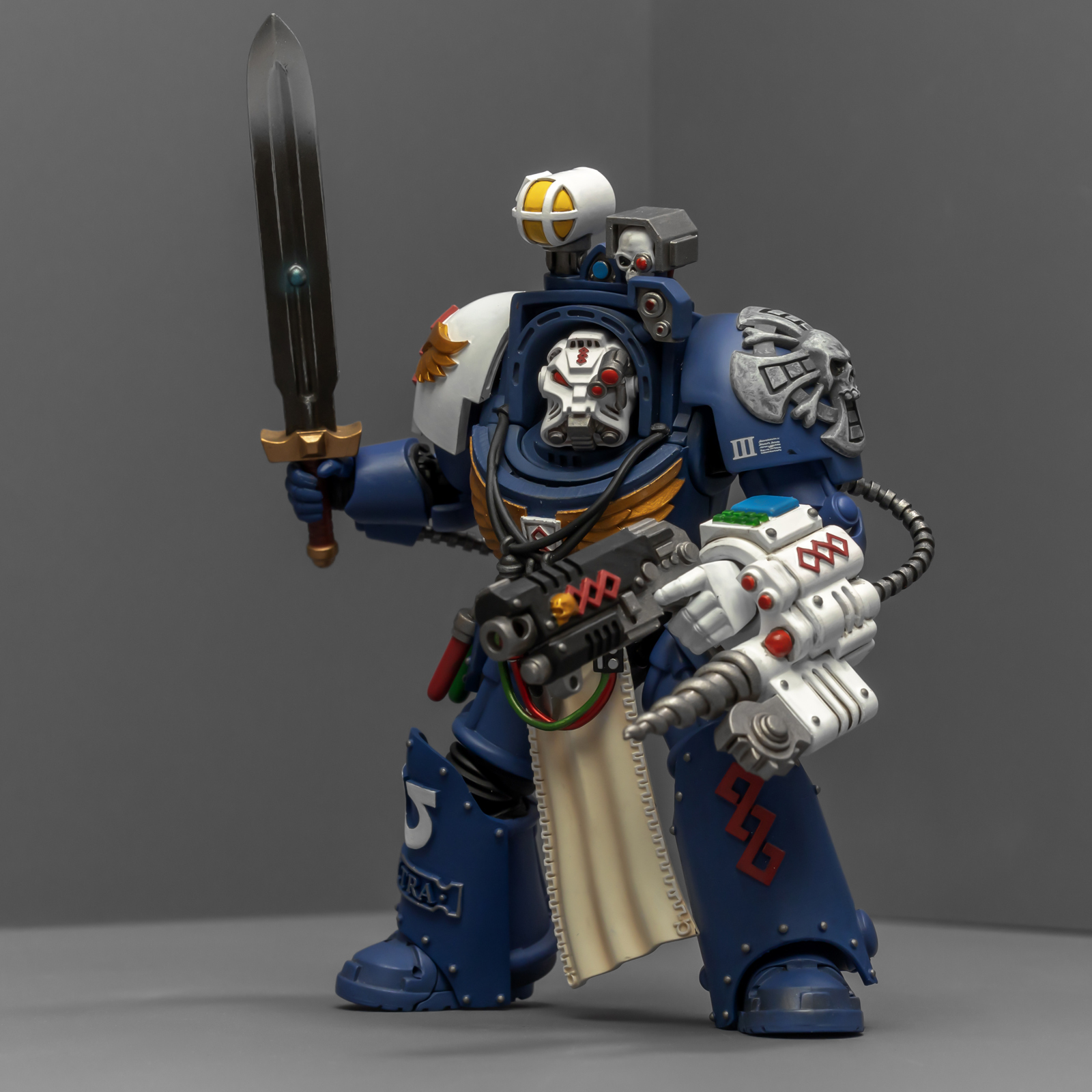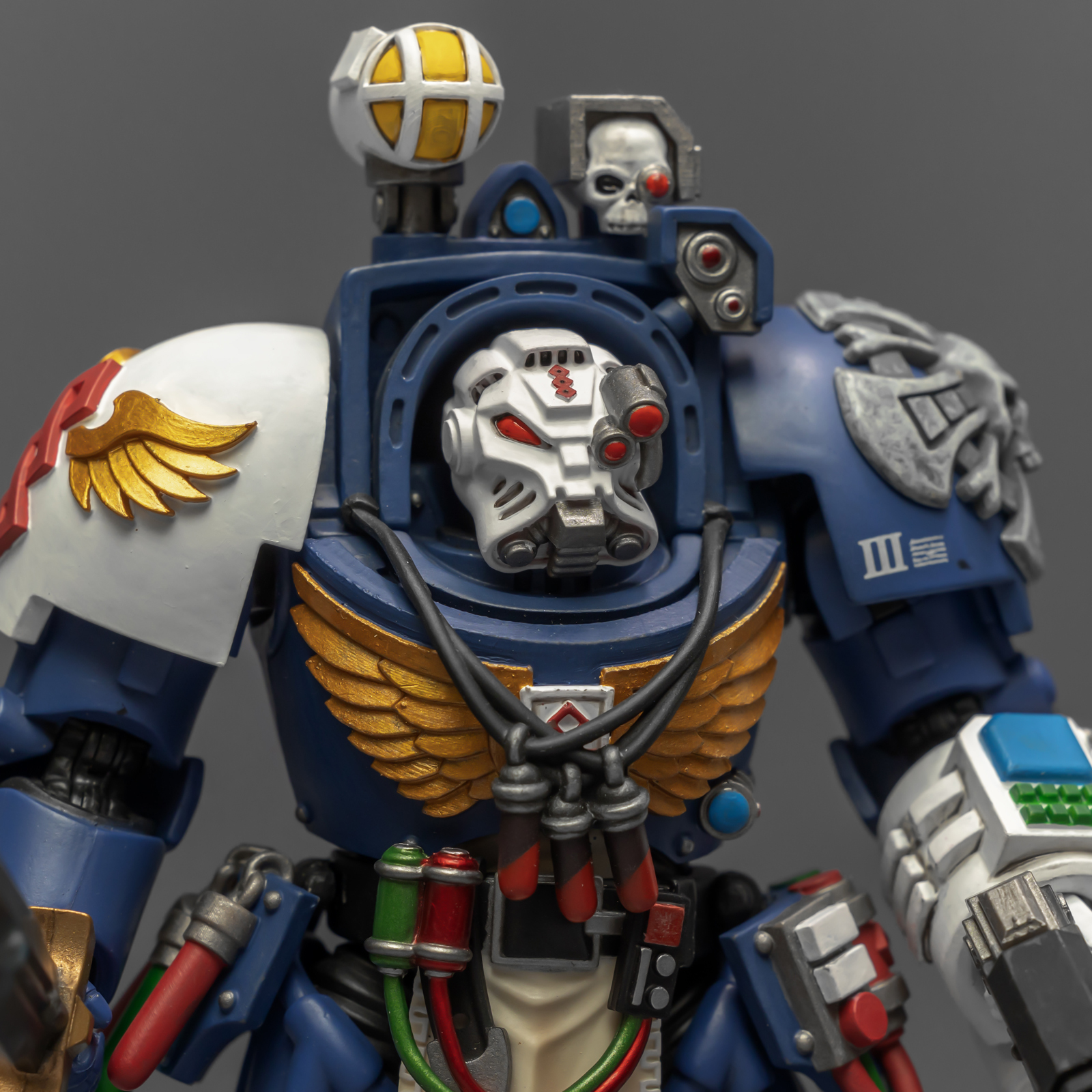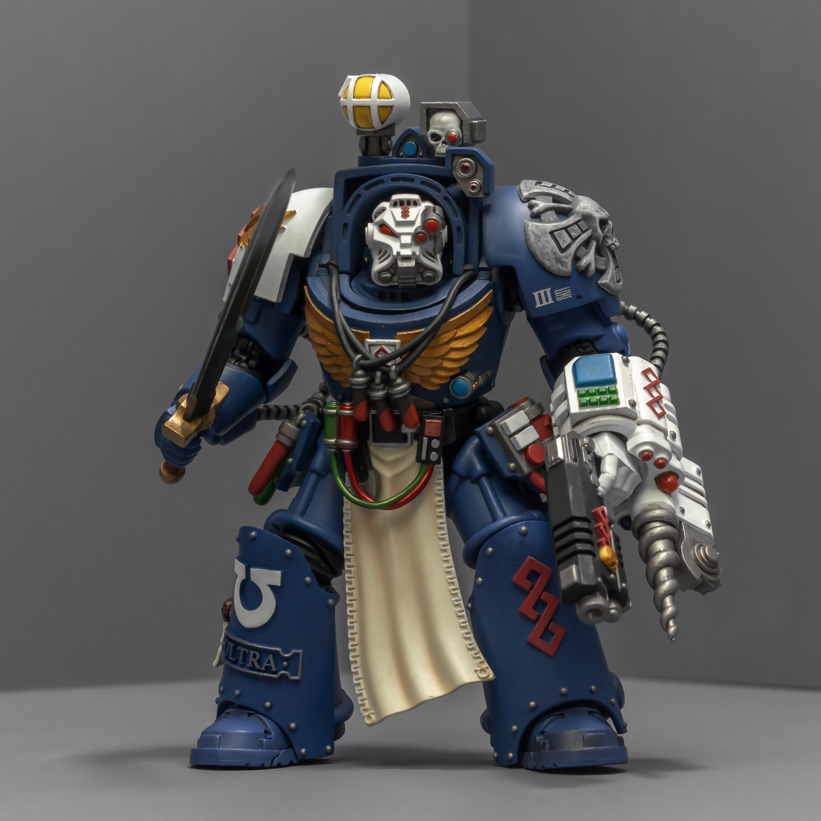 之前收过重甲版的生物药剂师,把两人放在一起,重力甲和终结者甲气质还挺搭。目前手头的极限战士终结者特殊单位里,除了之前用配件魔改的智库和牧师,现在又加入了药剂师,特别小队壮大了。智库和牧师都用了和普通甲相同的头盔,反观那个老老实实戴着终结者头盔的药剂师,和这两位站在一起倒是显得格格不入,我在想,是不是也该给他再换个头了?