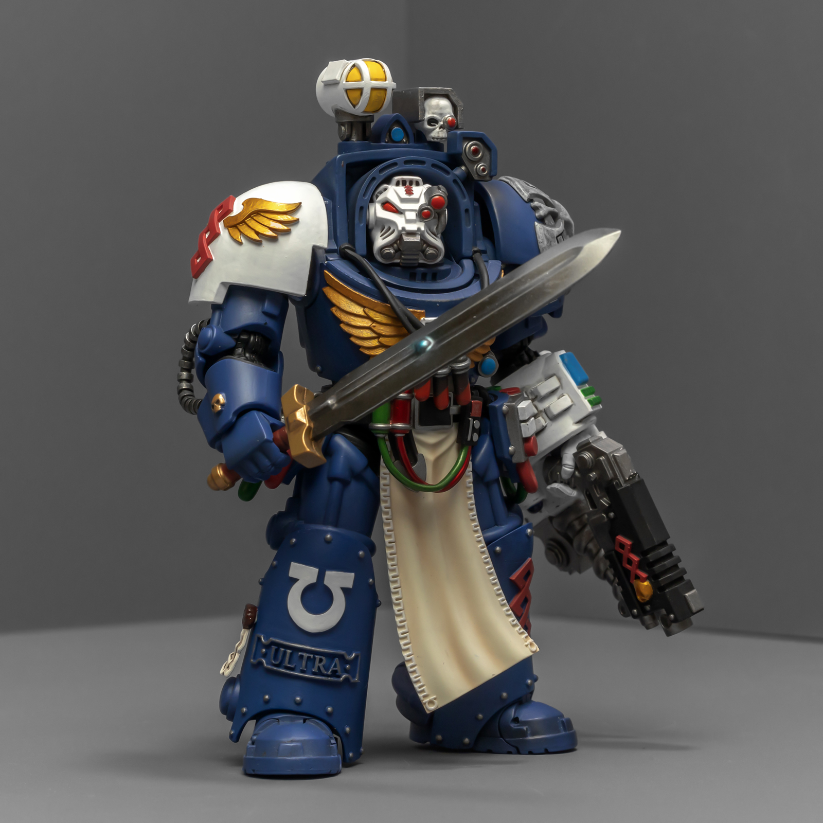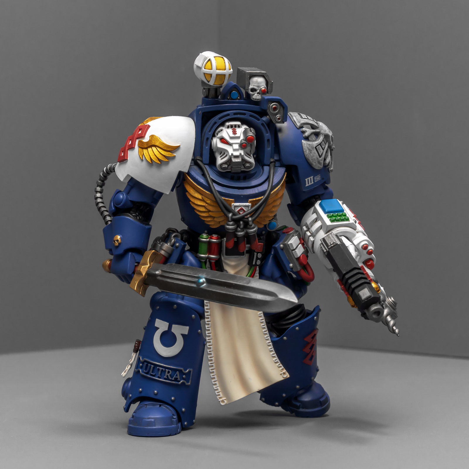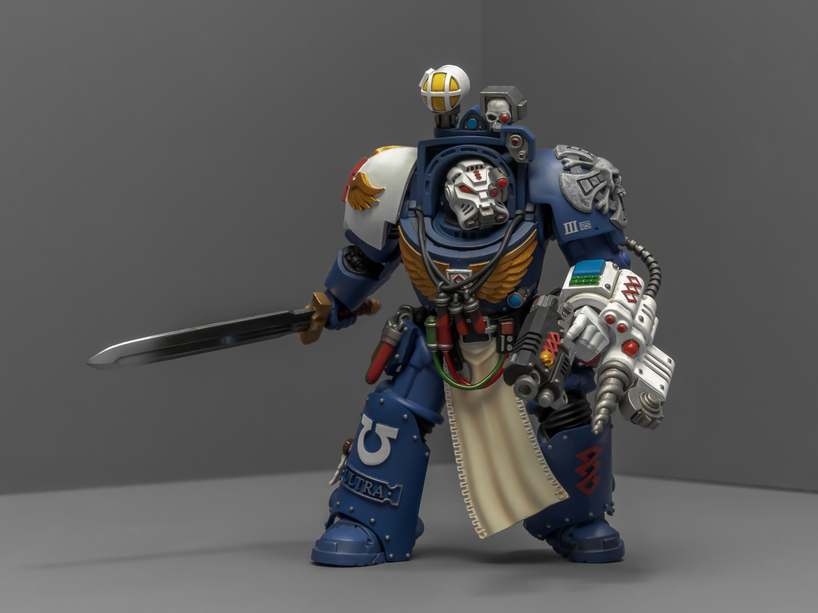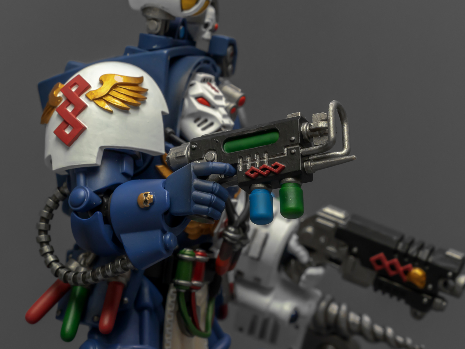 之前收过重甲版的生物药剂师,把两人放在一起,重力甲和终结者甲气质还挺搭。目前手头的极限战士终结者特殊单位里,除了之前用配件魔改的智库和牧师,现在又加入了药剂师,特别小队壮大了。智库和牧师都用了和普通甲相同的头盔,反观那个老老实实戴着终结者头盔的药剂师,和这两位站在一起倒是显得格格不入,我在想,是不是也该给他再换个头了?