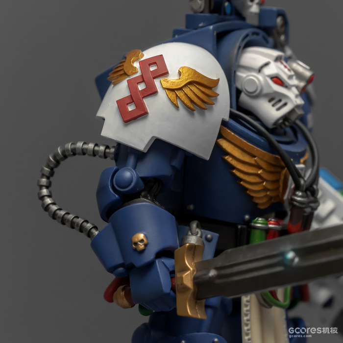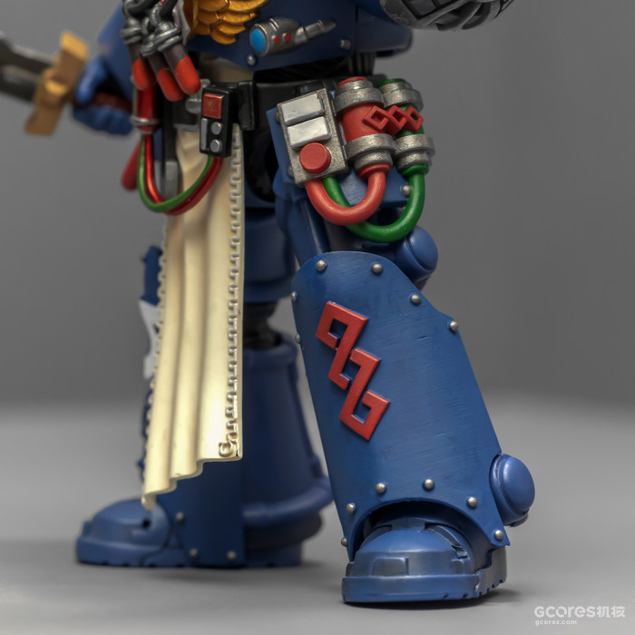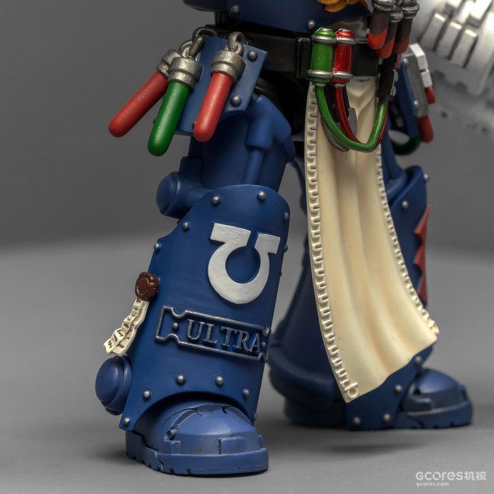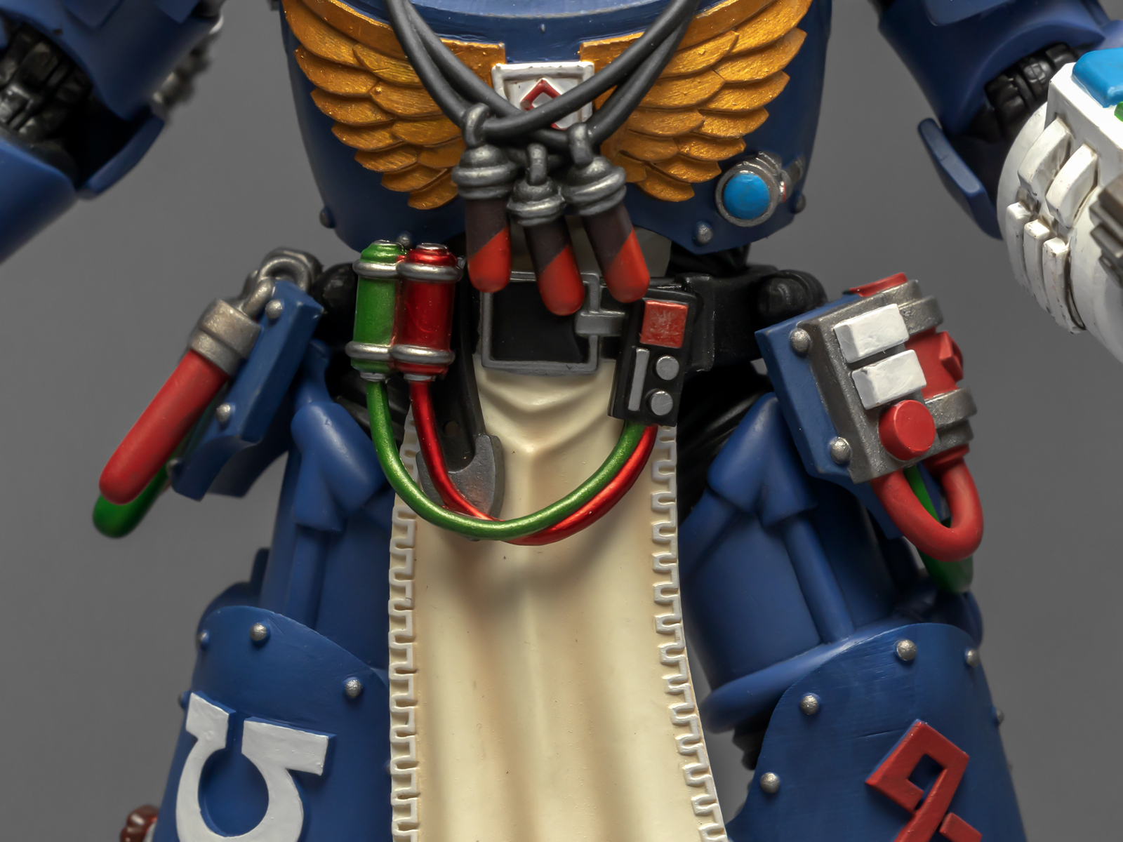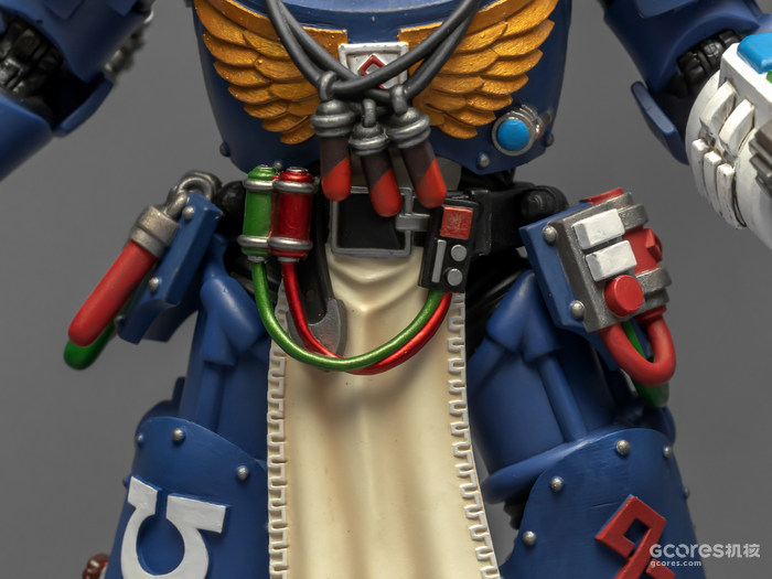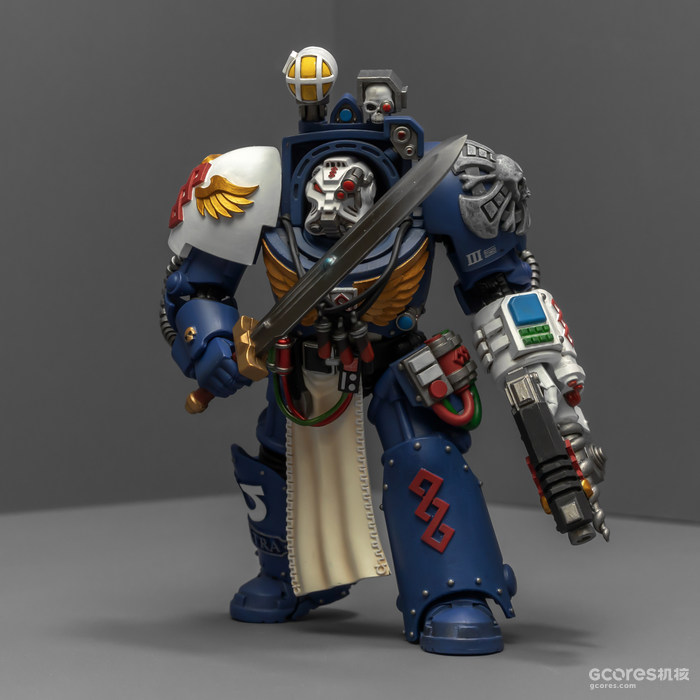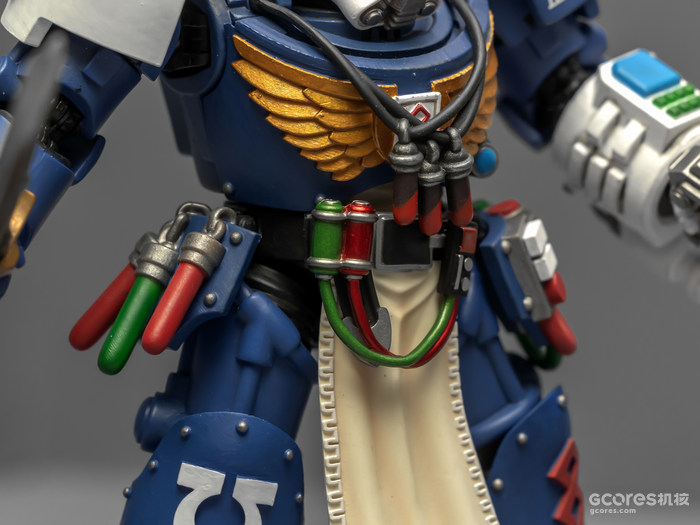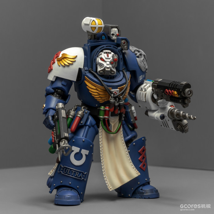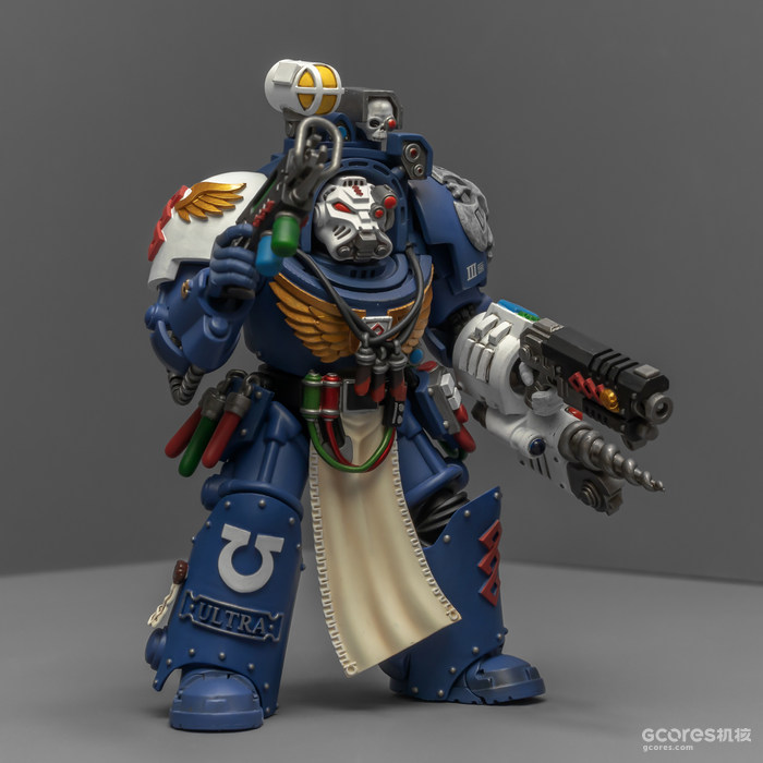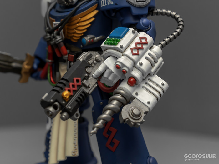左臂的医疗套件能辅助药剂师完成本职工作,除了一些急救功能,作为以保存战死星际战士身上基因种子为主要职责的药剂师,医疗套件上更显眼的部分是基因回收器,包括可以破开动力甲的金刚石钻头和单分子锯。