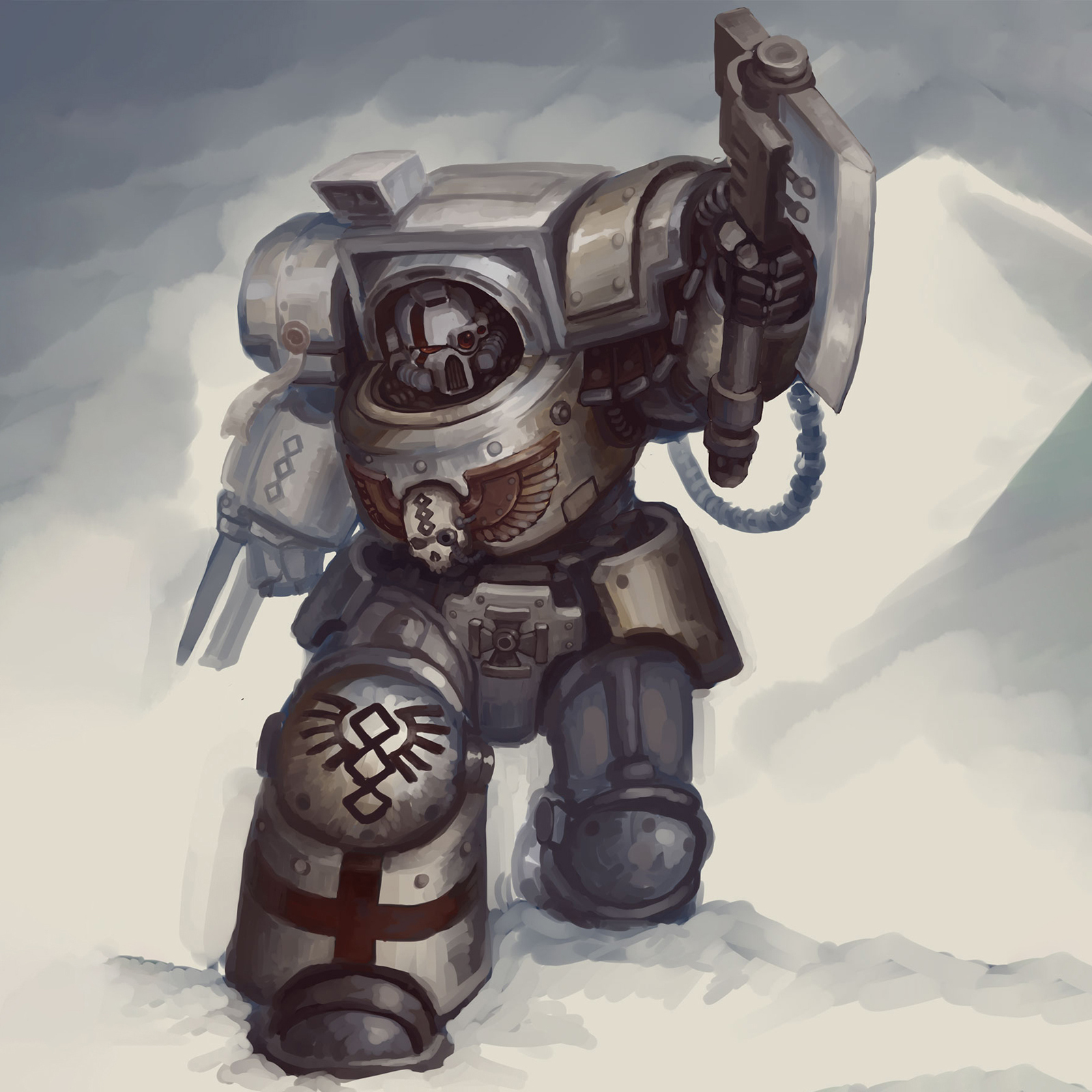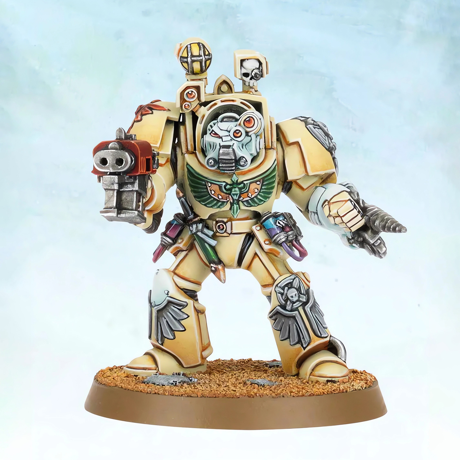 说起来,终结者装甲普遍都牺牲了速度来换取极致的防御性能,行动缓慢这一特点,对于需要穿梭战场快速抢救伤员的药剂师来说,基本不在考虑范围。但设定里总有例外,比如死翼终结者就曾有过相关官方规则。如果放眼粉丝的脑洞作品,这类搭配就更多了,甚至还有过帝子药剂师无畏这种离谱的空想画作,所以我搞这种改造多少也能算是有“据”可循。