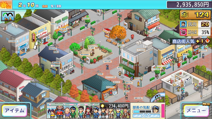 先透过赌博或打工累积创业资金,再开始建设各种设施吧!随著商店街日益繁荣,人潮不断涌入,财富滚滚而来!但要小心,如果被部长抓到你在上班时间偷懒摸鱼,可就惨了!