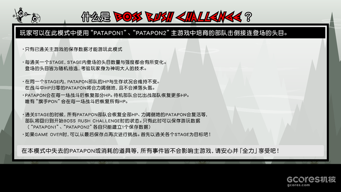 在本模式中失去的PATAPON或消耗的道具等,所有事件皆不会影响主游戏,请安心并「全力」享受吧。