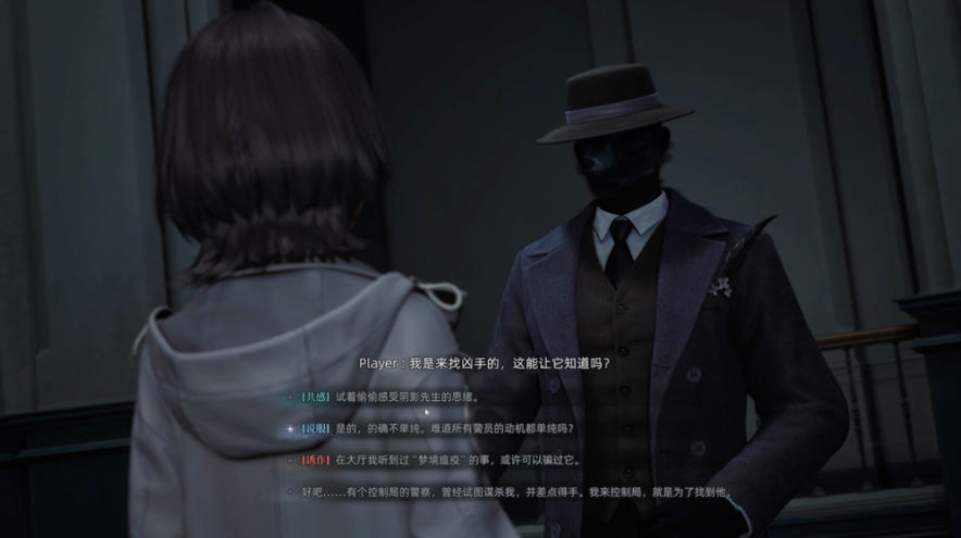 很有「美剧感」的科幻+犯罪+社会题材,以及画面质感暂且不论,面试过程中,从头到脚悬疑感十足的“谜语人”角色「阴影人」,让人想到《守望者》经典角色罗夏;与同伴「sayuki」出任务也好似好莱坞警匪片:“出警—拉开黄色隔离线—进场打怪”的流程……